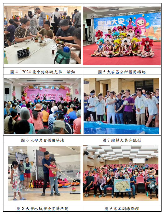 另外盧市長也幫忙宣傳「2024臺中海洋觀光季」,活動日期從113年8月3日至9月8日的每週六日,大安港媽祖文化園區已經被打造成海洋樂園,展示了多組可愛的海洋生物地景藝術品,更邀請到國內藝術家以大安舊名(海翁)為主題,創作「鯨艷大安」,為長達12公尺、寬3.5公尺、高4公尺的一組竹編鯨魚,民眾觀賞時可進入鯨魚內部,並將展示一些海廢物品,藉以宣導民眾勿將垃圾廢棄物丟入海中,危害海洋生物,將永續環保概念深植民眾心中,共同維護地球的環境。除了地景藝術和主題表演外,還有環境教育闖關遊戲以及水域安全宣導等知性的活動,歡迎踴躍報名參加。