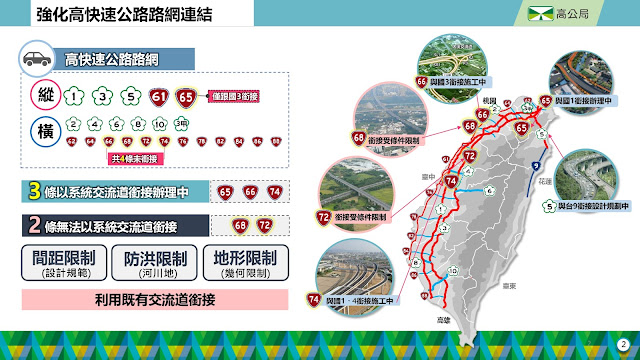 在健全海空港聯外運輸部分,高公局刻辦理國1 甲(桃園國際機場北側)、國 2 甲(桃園國際機場南側)及國7(銜接高雄港)等計畫之規劃;在強化高快速公路網的連接部分,高公局提出國1銜接台 65、國 1 銜接台74、國3銜接台66、國4豐原潭子段銜接台 74、國5銜接台9蘇花公路等計畫;改善國1瓶頸路段部分,高公局持續辦理五堵至汐止、楊梅至頭份、后里至大雅、彰化段等拓寬工程,亦針對台北都會區台北、圓山、林口等交流道進行改善。