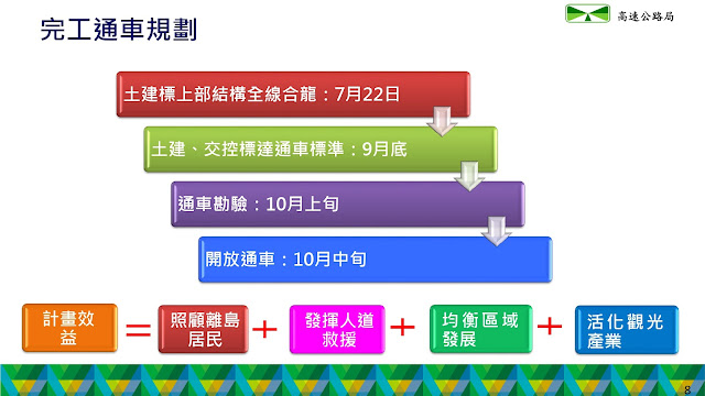 蘇院長表示,除了金門大橋外,政府近年來已陸續完成數項重大公路建設,例如分別歷時近8年的南迴公路與9年的蘇花改通車,以及費時13年的南橫全線通車,這都代表政府提升偏鄉、離島居民生活品質的決心。而藉由上述重要道路、橋梁的連通串接,不僅能更加穩定交通運輸,也有助帶動觀光產業發展、妥適醫療資源配置,促進地區區域繁榮。