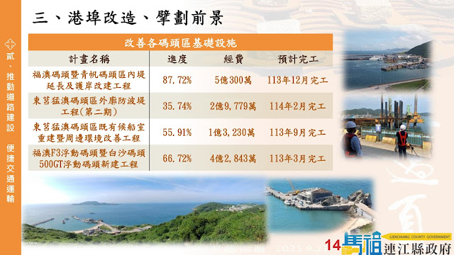 2. 優化四鄉五島港埠建設,加速建設各鄉浮動碼頭,以提供安全優質之港口設施;並以人本規劃為原則,檢討港口周邊停車、人行動線、指標安排以傳遞海港門戶之重要性。